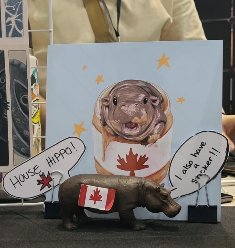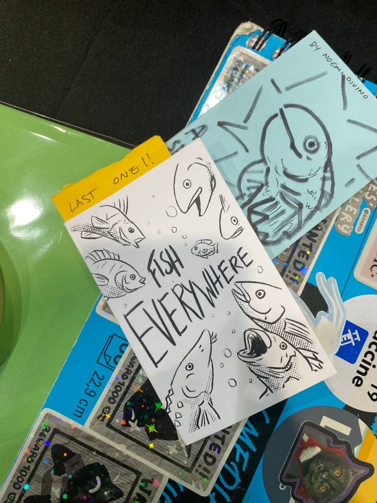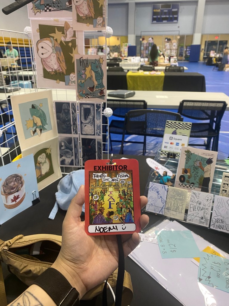 I got to the basketball court early on Day 2 since I had to create a new setup for the new artwork I was bringing in, and to figure out who to make my art look good. My table was located at a corner, so I had to make sure my comics and my artwork stood out. Grateful for the years in retail, merchandising products, and my customer service skills finally paid off! That day felt even busier than the first! I met new people, made connections, and actually sold out of my “Fish Everywhere” mini zine and my Canadian House Hippo sticker!! I even ran out of business cards and had to tape my last one down onto my table so that people could take a picture of it. It was honestly crazy. Even now, looking back, I just can’t believe I tabled at TCAF. I TABLED AT TCAF!! I SOLD MY ART AT TCAF!!! WTF!!!!