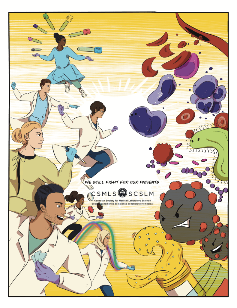 I was tasked to create a small comic showing medical lab professionals performing their duties in our healthcare system, and showing how they are superheroes inside and outside of the lab.