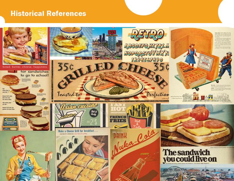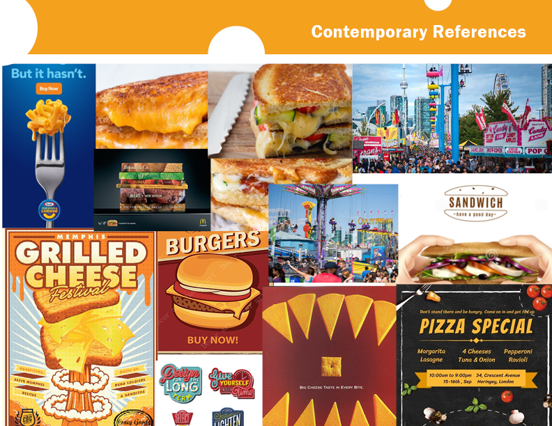 I chose to have both the historical references and the contemporary images center around cheese, specifically the colour of cheese (yellow-orange). In addition to the depictions of products with cheese I added references to the Canadian National Exhibition (CNE) to suit the history of the company and add a playfulness to the references.